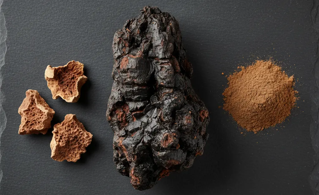 Chaga powder offers convenience and versatility. It can be made from simply grinding dried chaga chunks or through a more complex extraction process. Finely ground chaga powder can be steeped like loose-leaf tea, while dual-extract powders are typically more concentrated and dissolve easily in hot water, smoothies, or other beverages. When buying powder, it’s important to understand whether it is simple ground fungus or a potent extract.