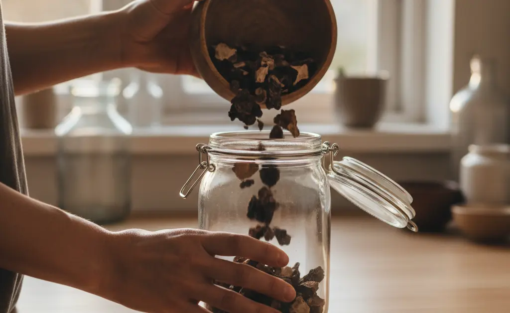 Dried chaga chunks and powder should be stored in an airtight container to protect them from air and moisture. Glass jars with tight-fitting lids are an excellent choice. The container should be kept in a cool, dark, and dry place, such as a pantry or cupboard. Avoid storing chaga near sources of heat, like a stove, or in areas with high humidity, like a refrigerator, as condensation can introduce moisture.