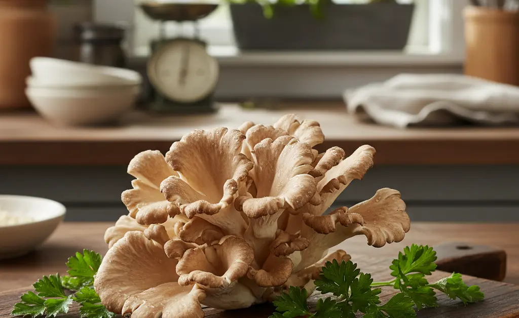 A beautiful cluster of raw Grifola frondosa on a clean surface, illustrating the potential use of maitake mushroom for blood sugar support.