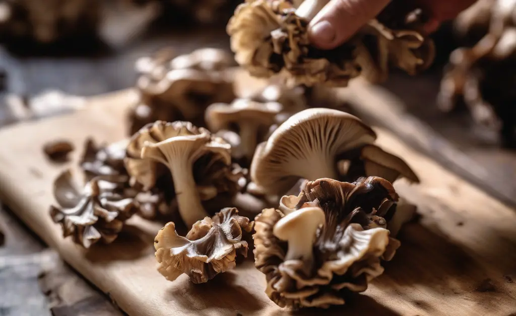 The common name ‘hen of the woods’ is purely descriptive of the mushroom’s appearance. Maitake grows in large, overlapping clusters at the base of trees, forming a shape that resembles the ruffled tail feathers of a hen sitting on a nest. This visual likeness has made the name a popular and intuitive way to identify it in the wild.