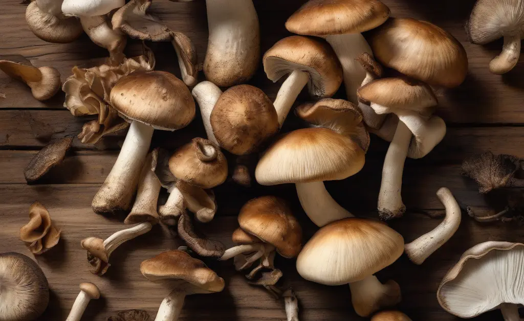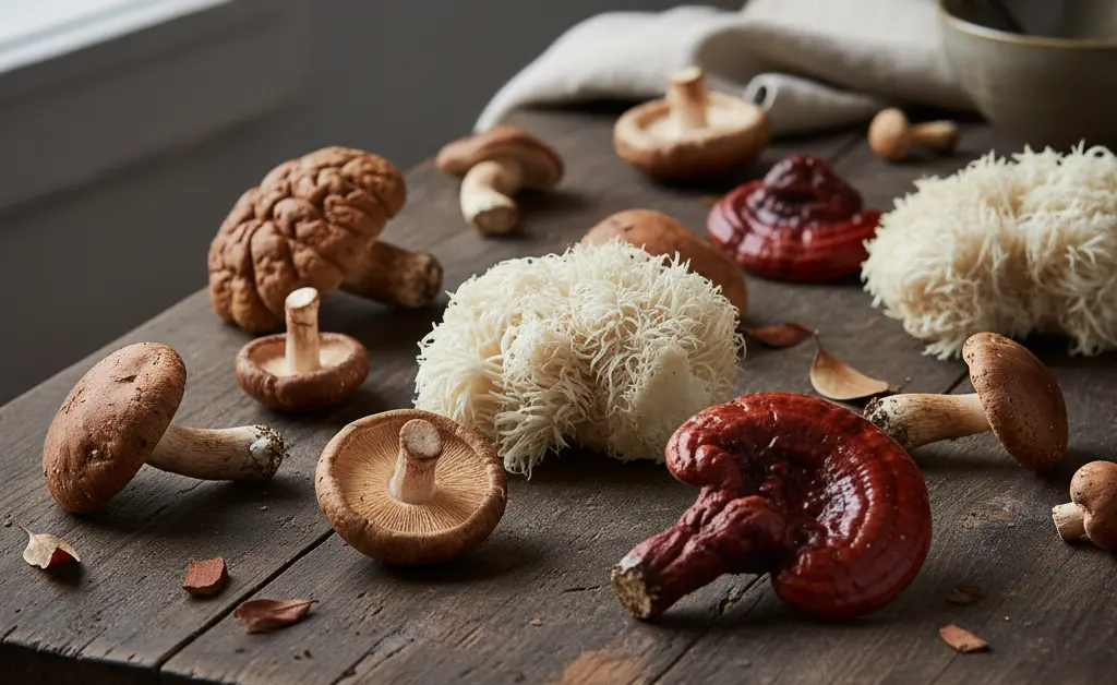 A visually appealing flat lay showcasing various types of medicinal mushrooms and the mushroom supplements benefits they offer.
