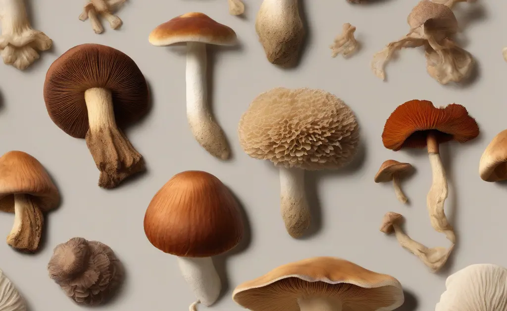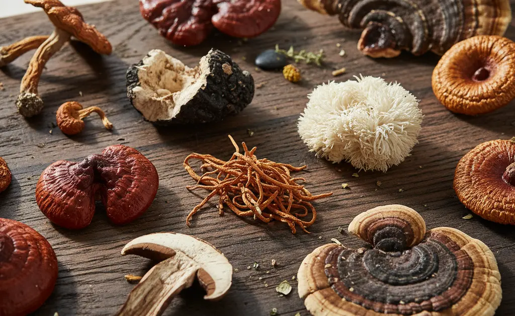 A carefully arranged selection of various dried medicinal mushrooms alongside modern capsules, representing mushroom supplements for kidney health.