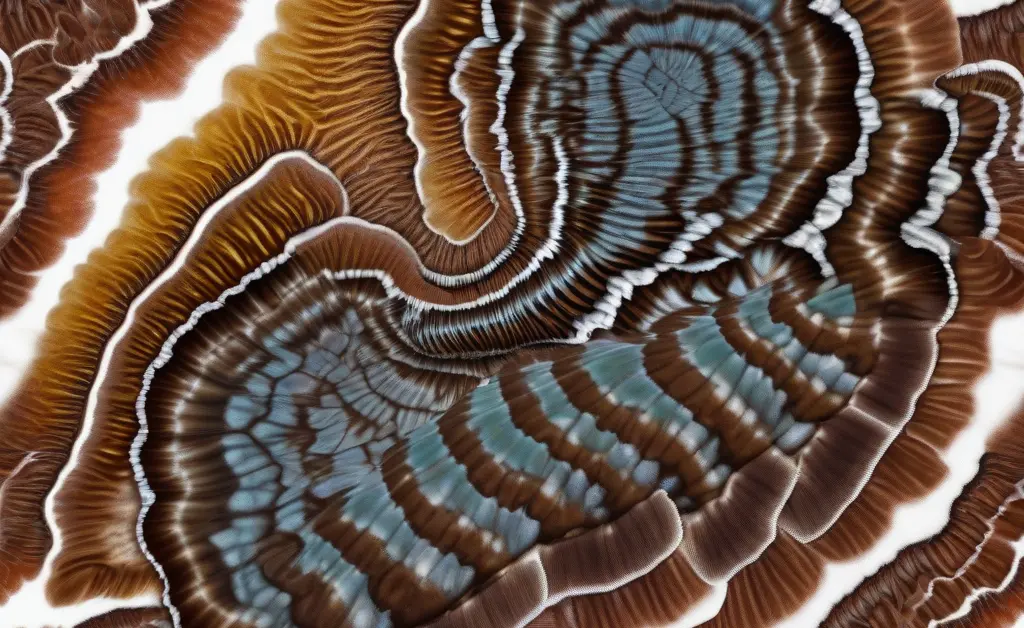 The cap of the Turkey Tail mushroom is perhaps its most distinguishing feature. It is typically thin, leathery, and fan-shaped or semicircular, often appearing in overlapping clusters. The surface is velvety or finely hairy, especially towards the margin. What truly sets the cap apart are its vibrant, concentric zones of color. These bands can exhibit a wide spectrum of hues, including browns, grays, blues, purples, greens, and even reds, often with a paler, sometimes whitish, outer edge. The precise color combination can vary significantly depending on environmental conditions, age, and geographical location, making each fruiting body a unique display of nature’s artistry. The zonate pattern is consistent, however, providing a reliable identification marker for trametes versicolor.