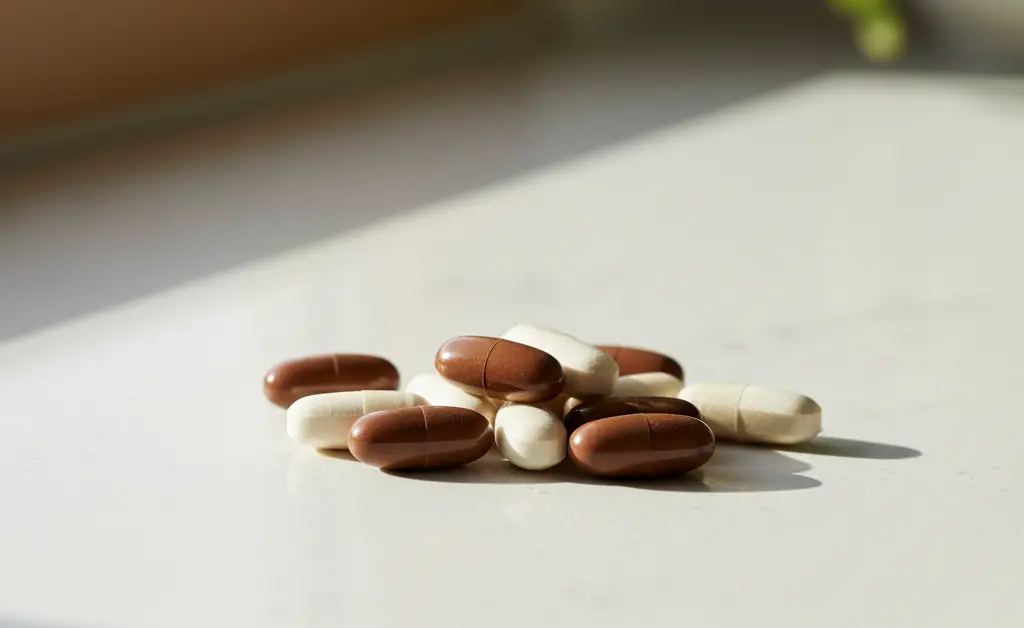 A curated selection of quality turkey tail mushroom capsules uk, presented artfully on a wooden surface.