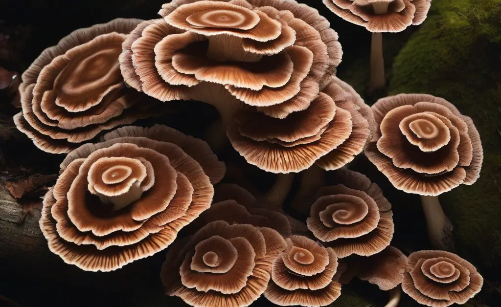 A close-up, studio-shot of vibrant turkey tail mushrooms, emphasizing their intricate patterns and earthy tones, presented as a natural element in discussions about turkey tail mushroom for belly fat loss.