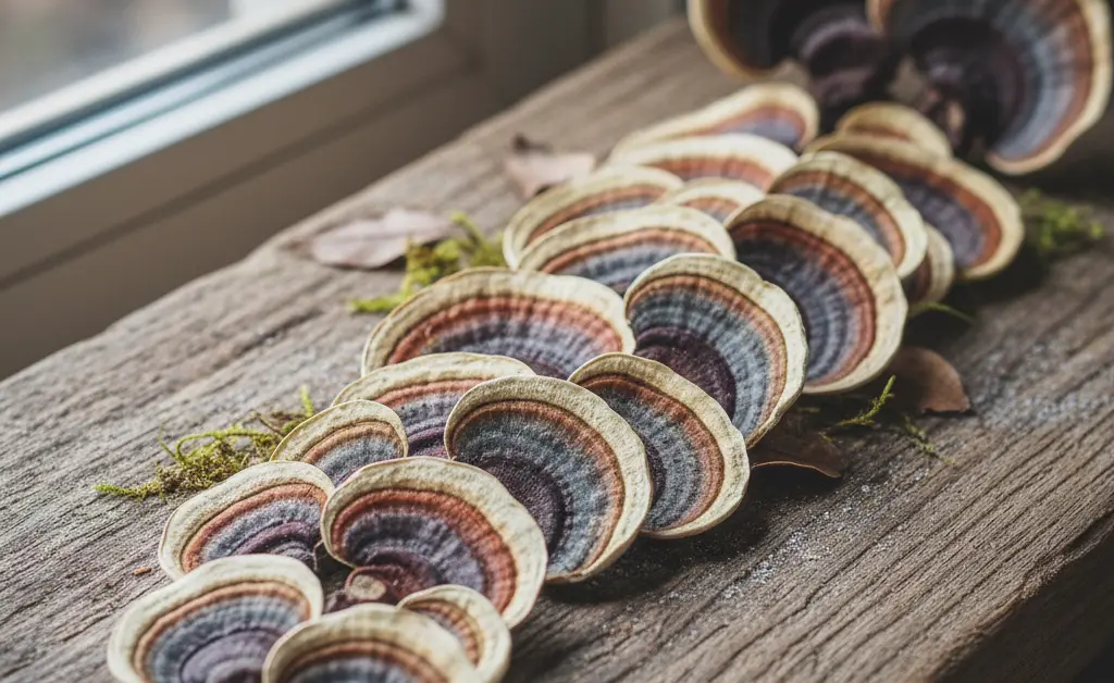A close-up, editorial photograph showcasing the intricate texture and vibrant colors of turkey tail mushroom for fatty lumps, presented in a natural setting.