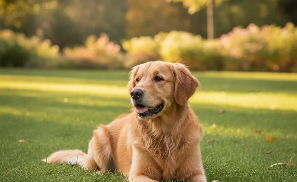 A healthy, happy Golden Retriever sitting calmly outdoors, with a visually appealing arrangement of turkey tail mushrooms placed artfully nearby, highlighting the benefits of turkey tail mushroom for golden retrievers.