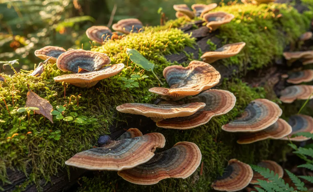 An editorial photograph showcases the intricate beauty of the turkey tail mushroom in russian, highlighting its distinct concentric rings and earthy tones in a natural forest setting.