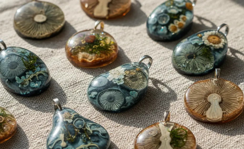 Common materials include sterling silver, brass, and copper for metalwork, often paired with durable resins to encapsulate delicate fungi or create realistic replicas. Artists also frequently incorporate natural elements such as ethically sourced wood, dried botanicals, and sometimes even treated slices of actual mushrooms.