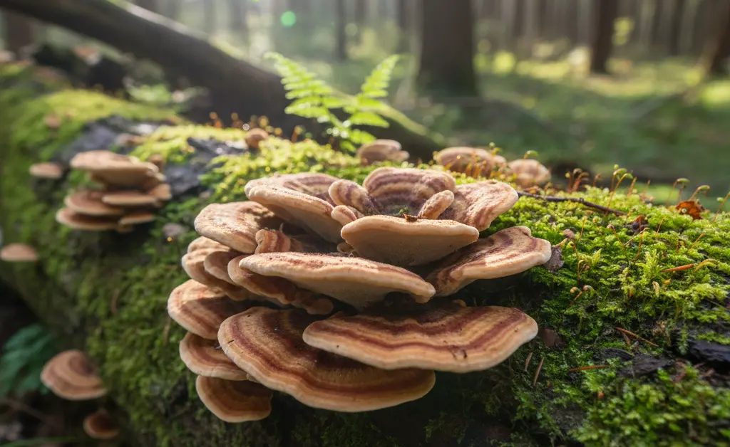 Turkey tail mushrooms are widely distributed globally, thriving on dead hardwood logs, stumps, and fallen branches. They are important decomposers in forest environments, helping to break down woody debris. You can often spot them growing in tiered, overlapping clusters in temperate forests.
