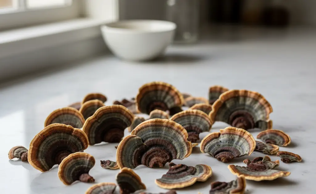 A high-angle view showcases a selection of turkey tail mushroom nz chemist warehouse products neatly arranged on a clean, modern shelf, bathed in soft, natural light.